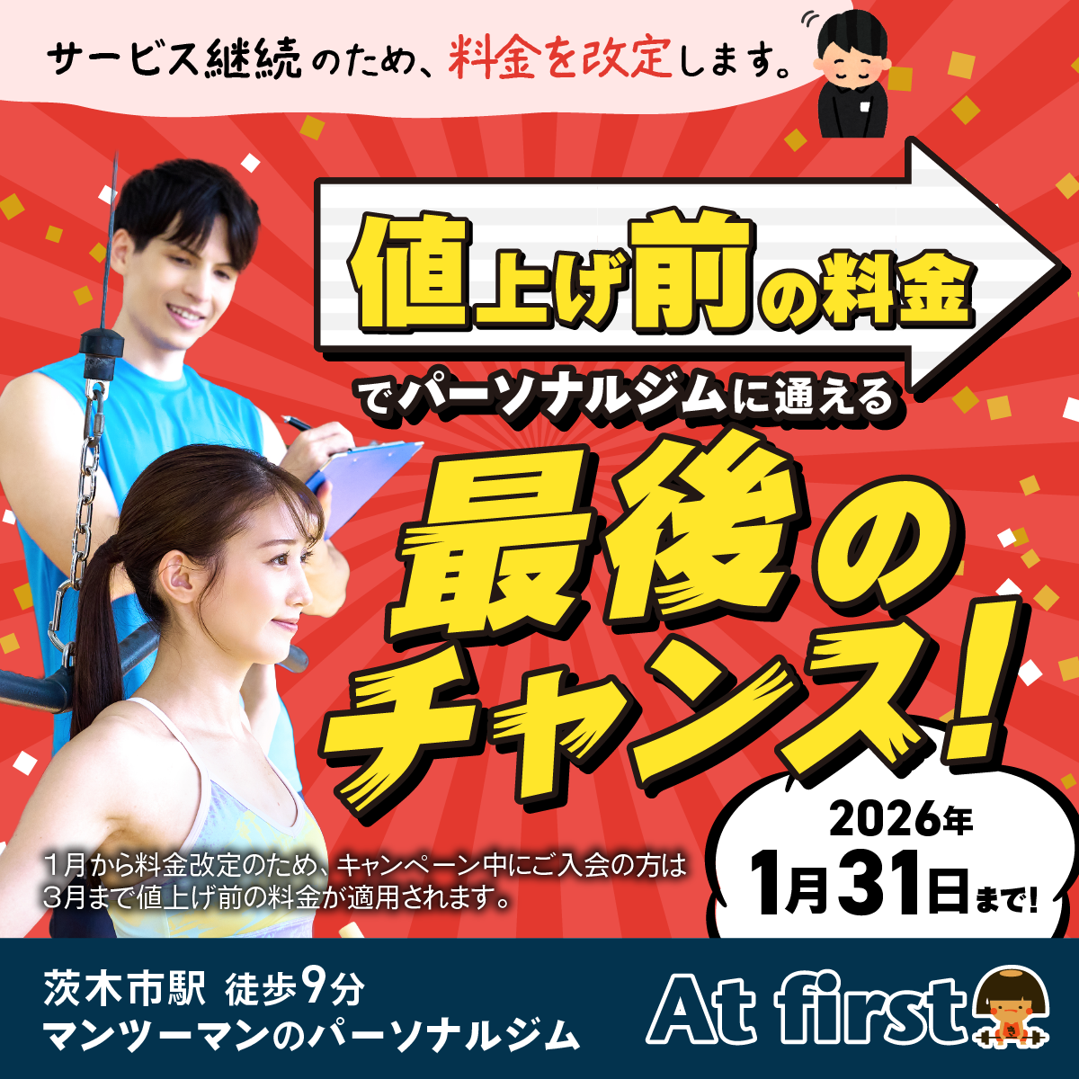 ピックアップ ホーム > お知らせ&トピックス > ピックアップ ピックアップ一覧 【大切なお知らせ】サービス向上のための料金改定について カテゴリー:お知らせ、ピックアップ いつも当ジムをご利用いただき、誠にありがとうございます。 皆さまがトレーニングに励まれている姿を… 記事を読む ロッテのパーソナルジム検索サイト『FIT PALETTE』へ掲載されました! カテゴリー:お知らせ、ピックアップ このたび、アットファーストがロッテメディパレットが運営するFIT PALETTEの 「茨木市のパ… 記事を読む 30-40代の女性を悩ます浮腫(むくみ)のワケと解消法 カテゴリー:ピックアップ こんにちは。阪急茨木市駅から徒歩9分の場所にある、パーソナルトレーニングジムのAt firstです! … 記事を読む アクティブシニアを目指すなら運動をしよう! カテゴリー:ピックアップ 茨木市のパーソナルトレーニングジムのアットファーストです。 社会は高齢化が進んでいますが、実は高… 記事を読む 価格変更のお知らせ カテゴリー:お知らせ、ピックアップ 拝啓、皆様におかれましては益々ご清祥のこととお喜び申し上げます。平素より当店をご愛顧いただきまして誠に… 記事を読む なぜなの?冬になるとひどくなる肩こり カテゴリー:ピックアップ、肩こり解消トレーニング 例年にくらべて暖かい12月を終えて、例年通り寒い1月がやって来ました。そうなると、なんだか肩こりがひど… 記事を読む カテゴリー お知らせ キャンペーン情報 ストレス解消 ダイエット ダイエット食事メニュー トレーニング優秀賞表彰 パーソナルジムの紹介 ピックアップ 中年太りダイエット 熱中症対策 産後太りのトレーニング 筋トレ 肩こり解消トレーニング 運動不足解消